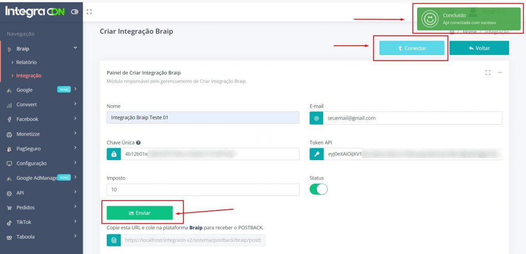 13 – Após realizar os procedimentos descritos acima, volte ao sistema IntegraOn e clique no botão “Conectar” para verificar se foi realizada a conexão com a plataforma Braip. Caso estejam todos os dados corretos o sistema irá apresentar a mensagem de “API conectada com sucesso”. Depois clique no botão “Enviar” para finalizar o cadastro. Conforme exemplo abaixo: