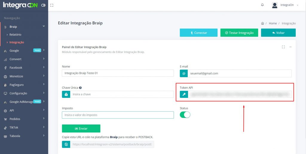 7 – Após copiar o Token, insira-o dentro do sistema IntegraOn(Braip->integração) no campo “Token API”. Conforme exemplo abaixo: