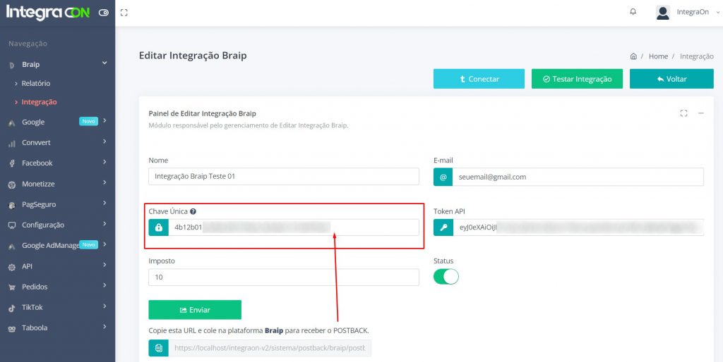 9 – Após copiar a Chave Única, insira-a dentro do sistema IntegraOn(Braip->integração) no campo “Chave Única”. Conforme exemplo abaixo: