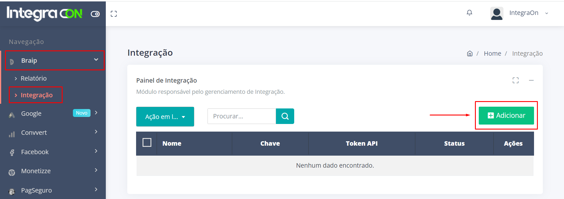 1 – Acesse o sistema IntegraOn, localize o menu “Braip->Integração” e clique no botão “Adicionar”. Conforme exemplo abaixo: