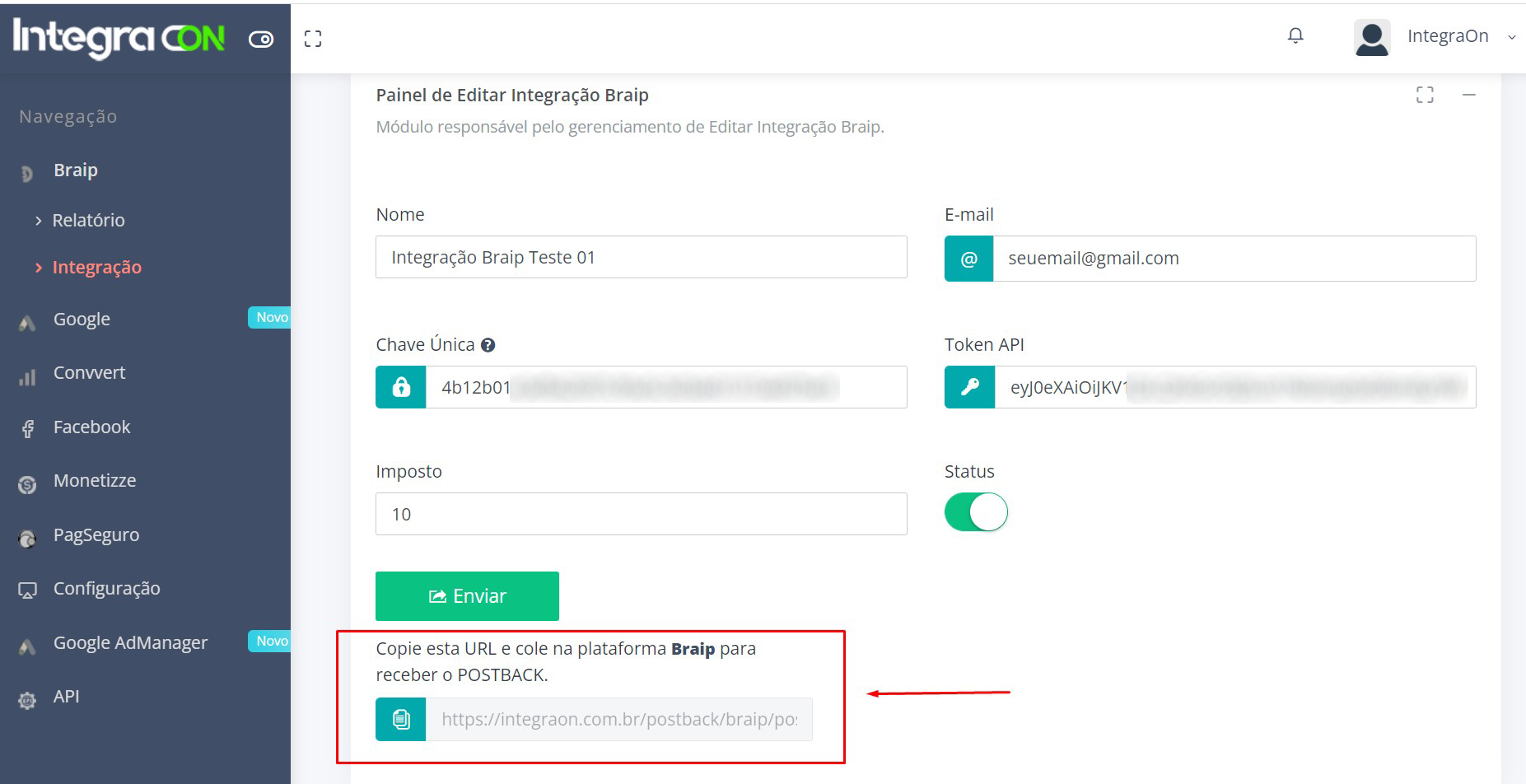 9 – Após copiar a Chave Única, insira-a dentro do sistema IntegraOn(Braip->integração) no campo “Chave Única”. Conforme exemplo abaixo: