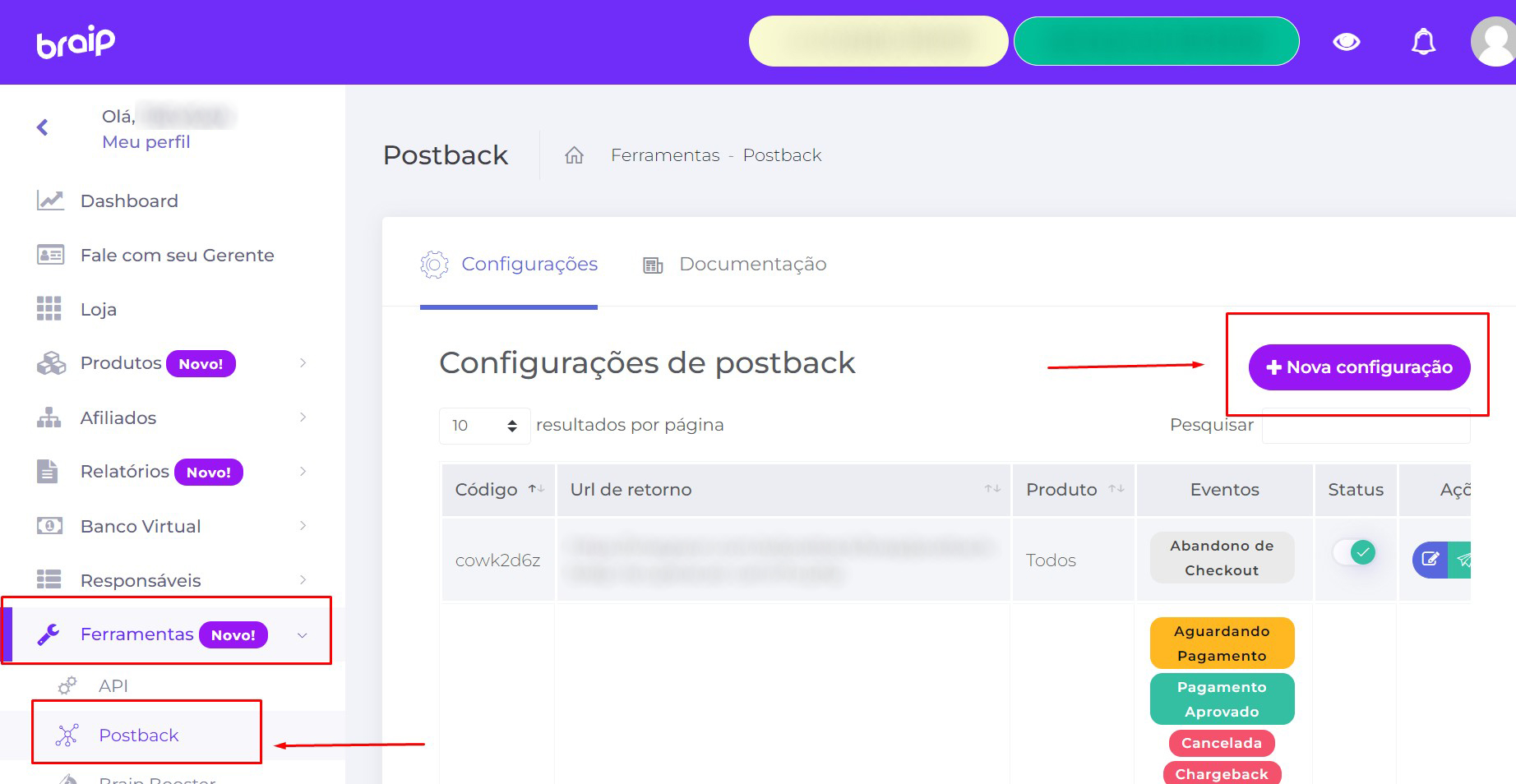 11 – Após copiar a URL, acesso a plataforma Braip->Ferramentas->PostBack e clique em “Nova Configuração”. Conforme exemplo abaixo: