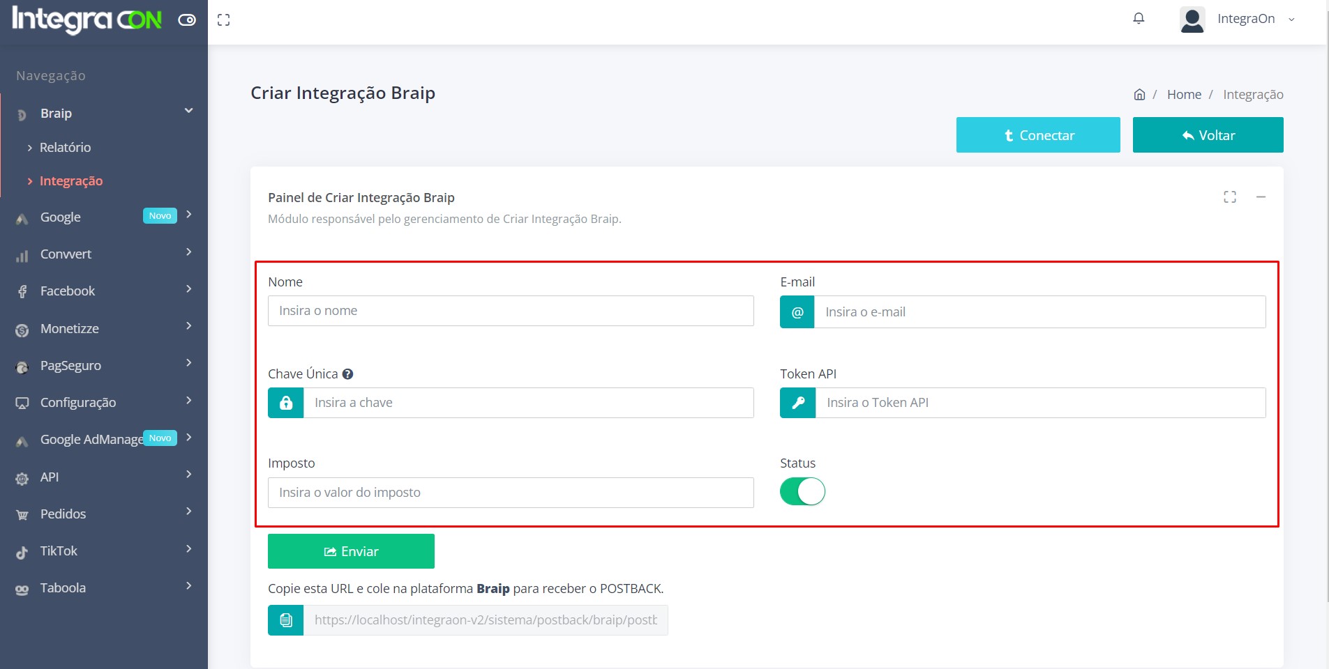 13 – Após realizar os procedimentos descritos acima, volte ao sistema IntegraOn e clique no botão “Conectar” para verificar se foi realizada a conexão com a plataforma Braip. Caso estejam todos os dados corretos o sistema irá apresentar a mensagem de “API conectada com sucesso”. Depois clique no botão “Enviar” para finalizar o cadastro. Conforme exemplo abaixo: