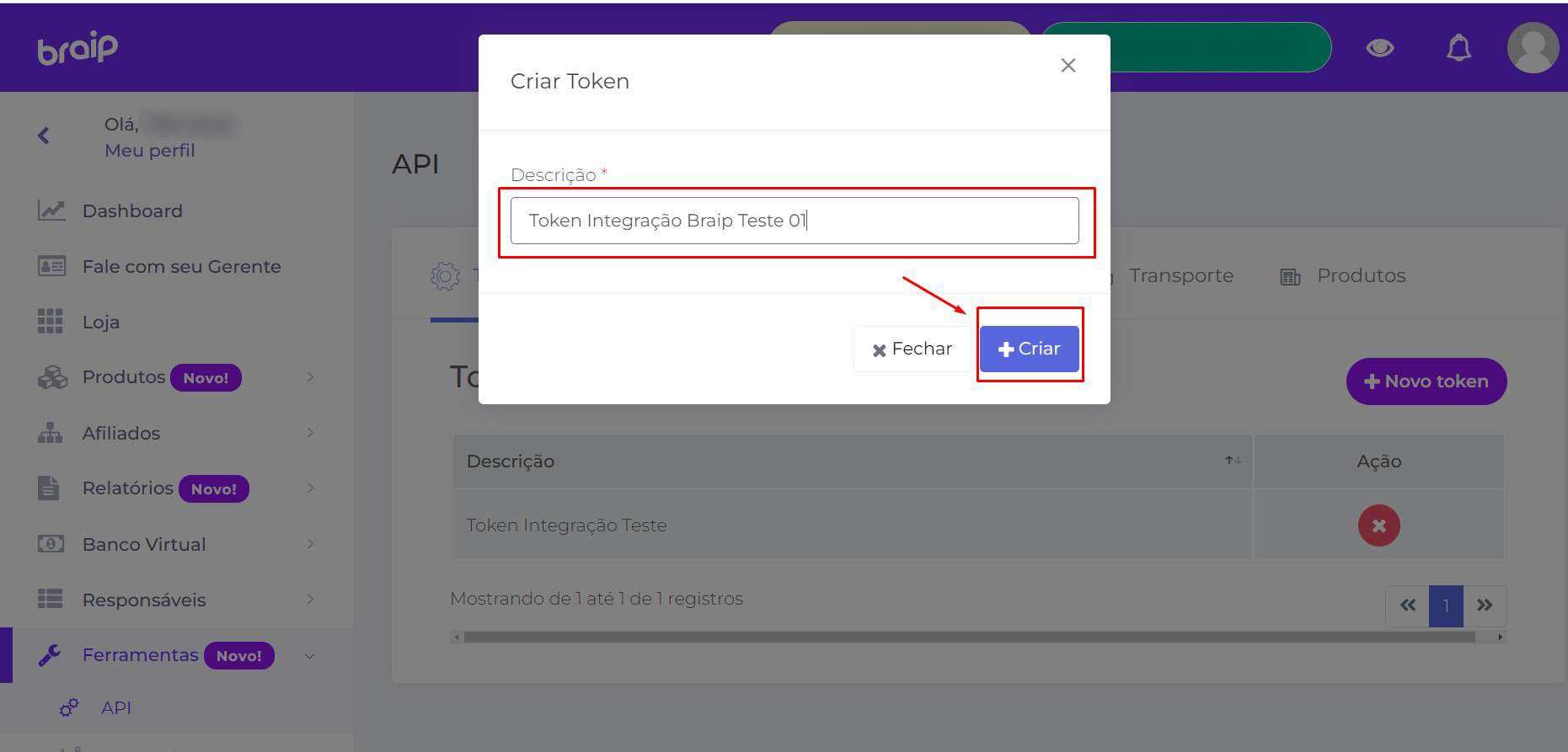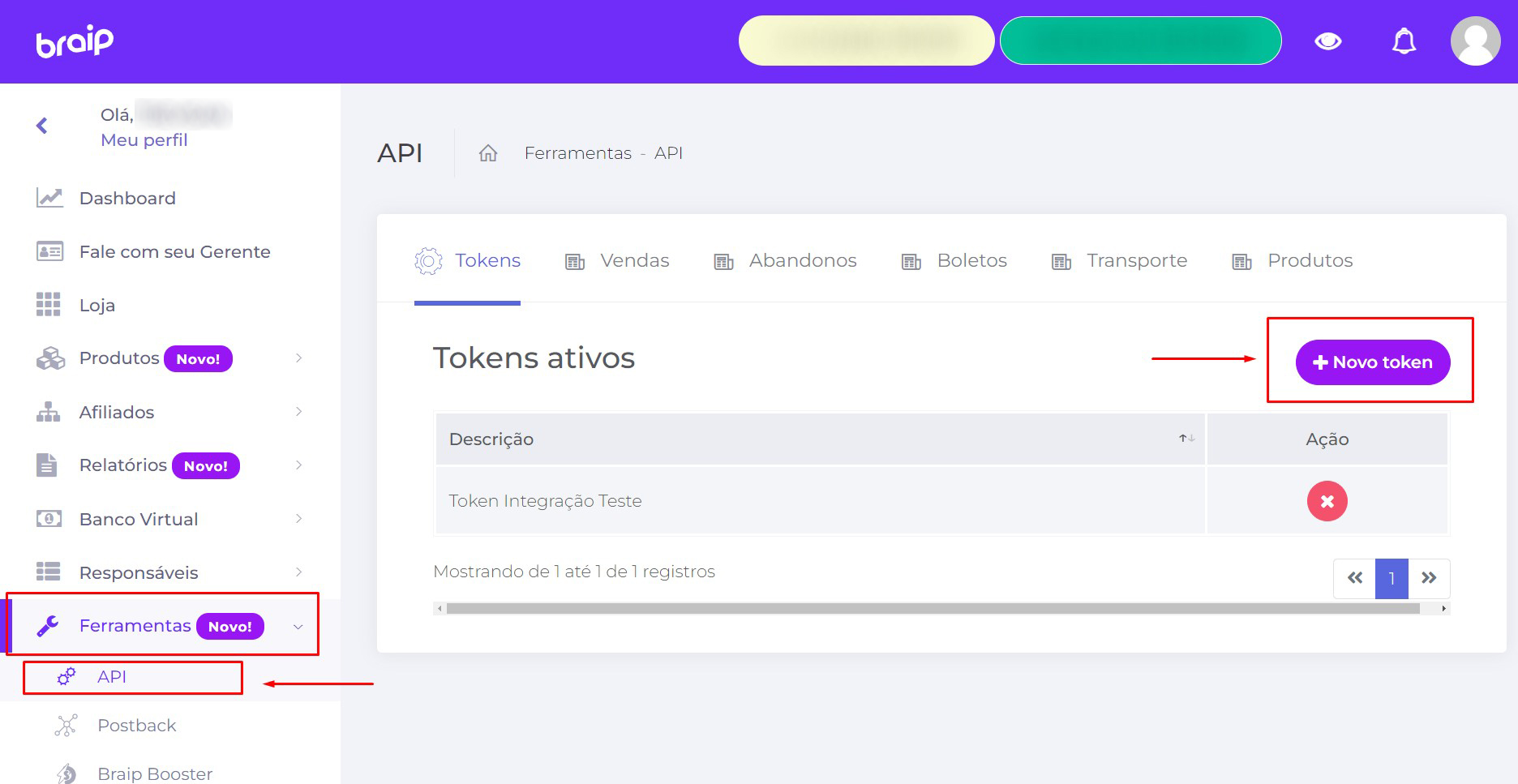 4 – Ao acessar a plataforma Braip, localize o menu “Ferramentas->API” e depois clique na opção “Novo Token”, conforme exemplo abaixo: