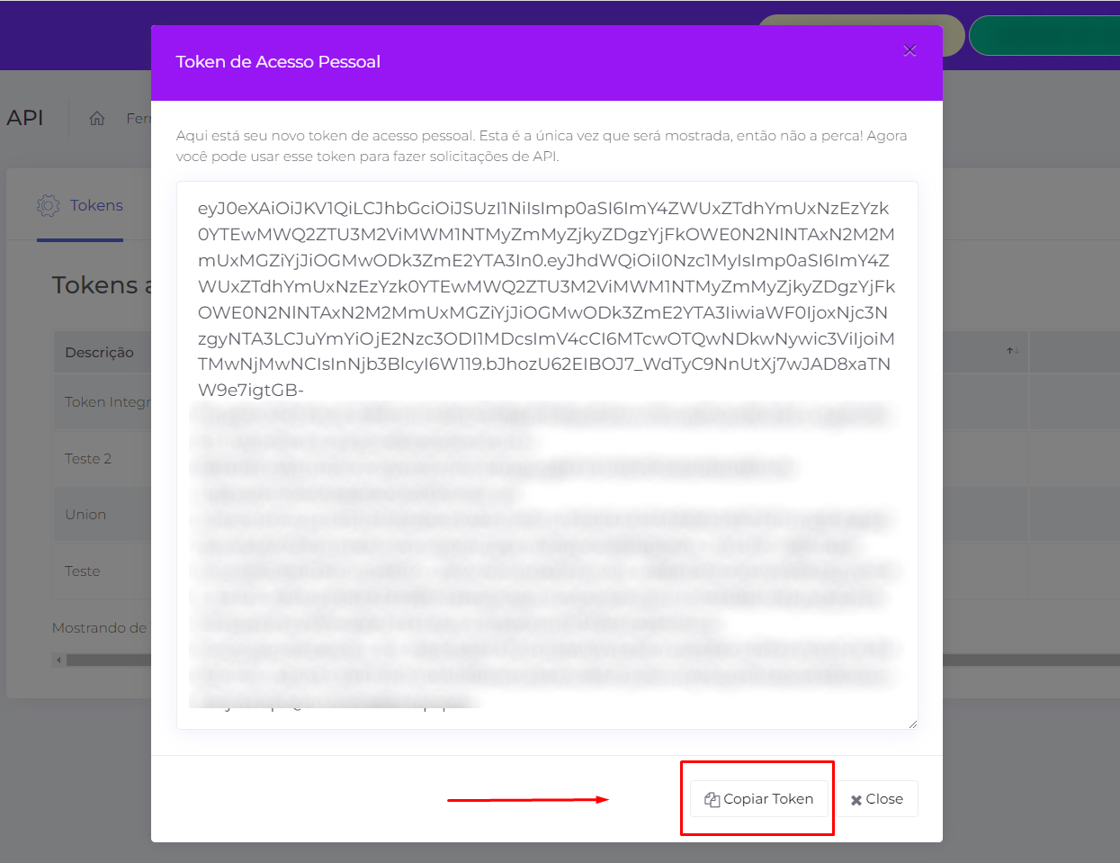 6 – Após clicar em “Criar”, será apresentado em tela o Token API, conforme exemplo abaixo: