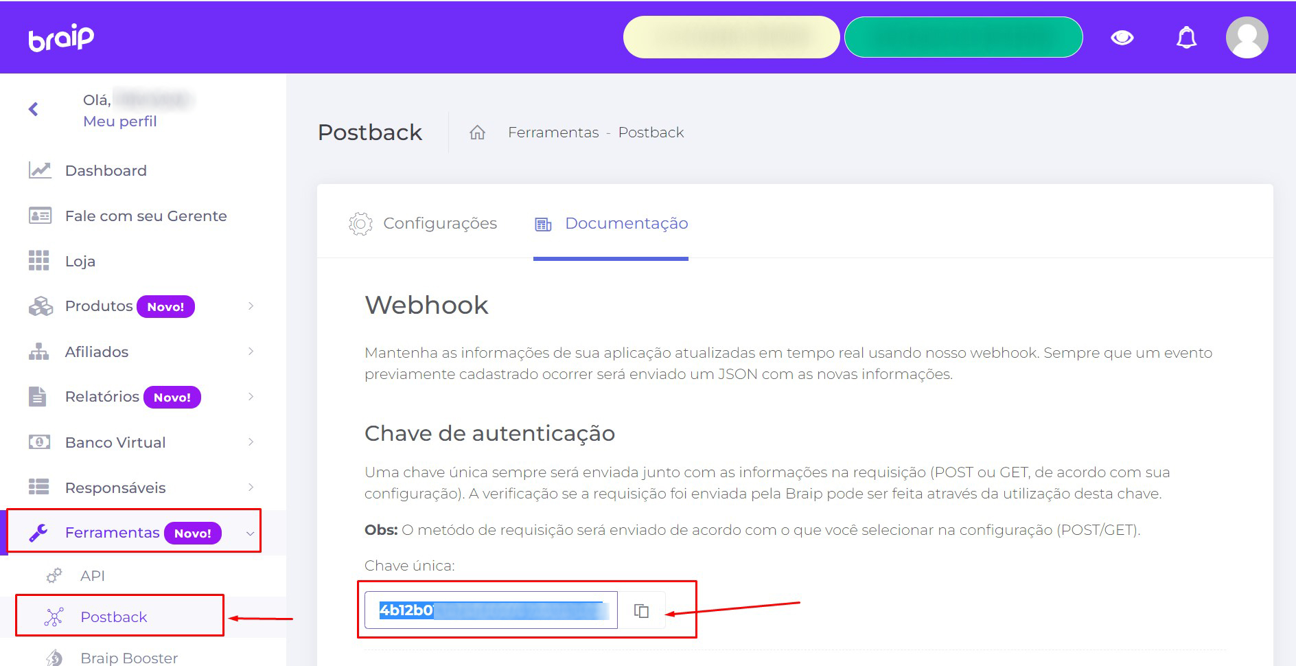 8 – Neste passo a passo vamos localizar a Chave Única. Dentro da plataforma Braip selecione a opção “Ferramentas->Postback”, clique em “Documentação” e copie a “Chave Única”, conforme exemplo abaixo: