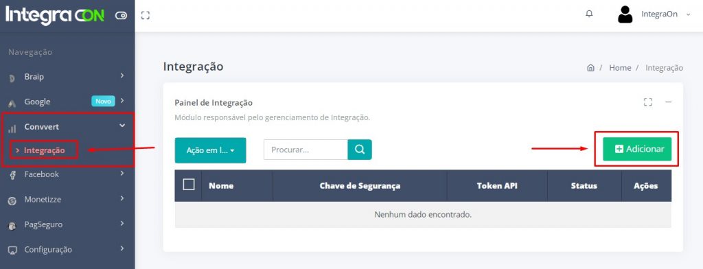 1 – Acesse o sistema IntegraOn, localize o menu “Convvert->Integração” e clique no botão “Adicionar”. Conforme exemplo abaixo: