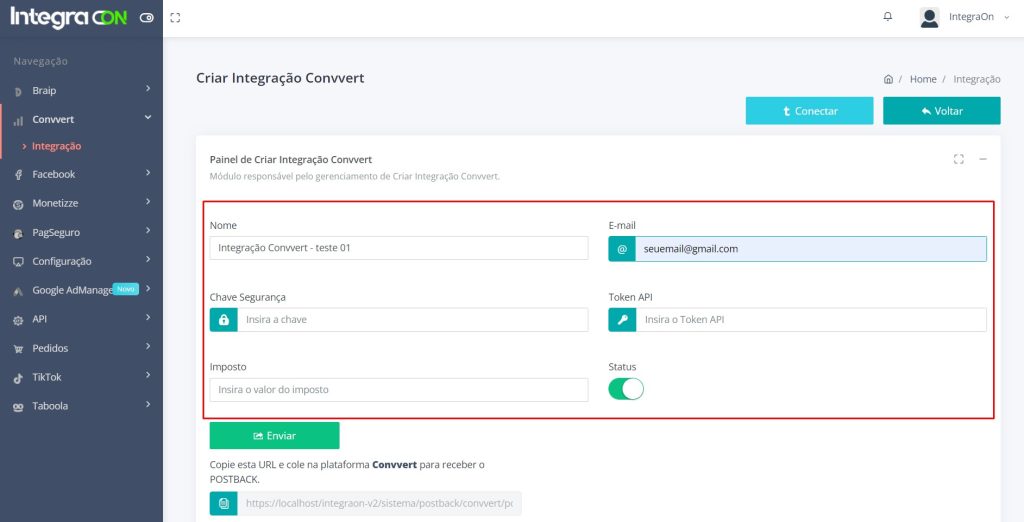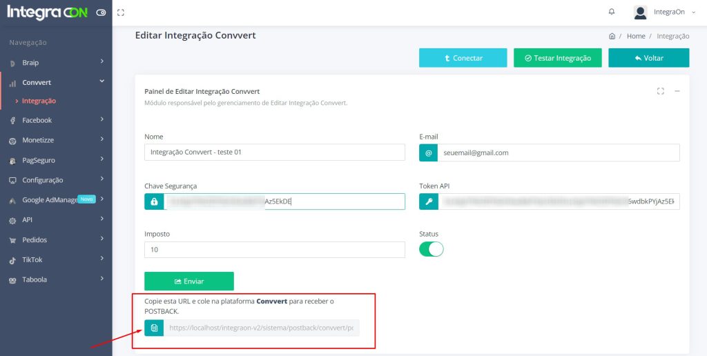10 – Neste passo vamos copiar a URL de Postback informada no sistema IntegraOn e configura-la dentro da plataforma Convvert. Conforme exemplo abaixo: