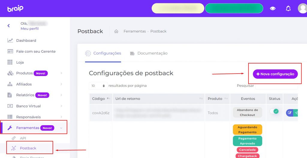 11 – Após copiar a URL, acesso a plataforma Convvert->Ferramentas->PostBack e clique em “Nova Configuração”. Conforme exemplo abaixo: