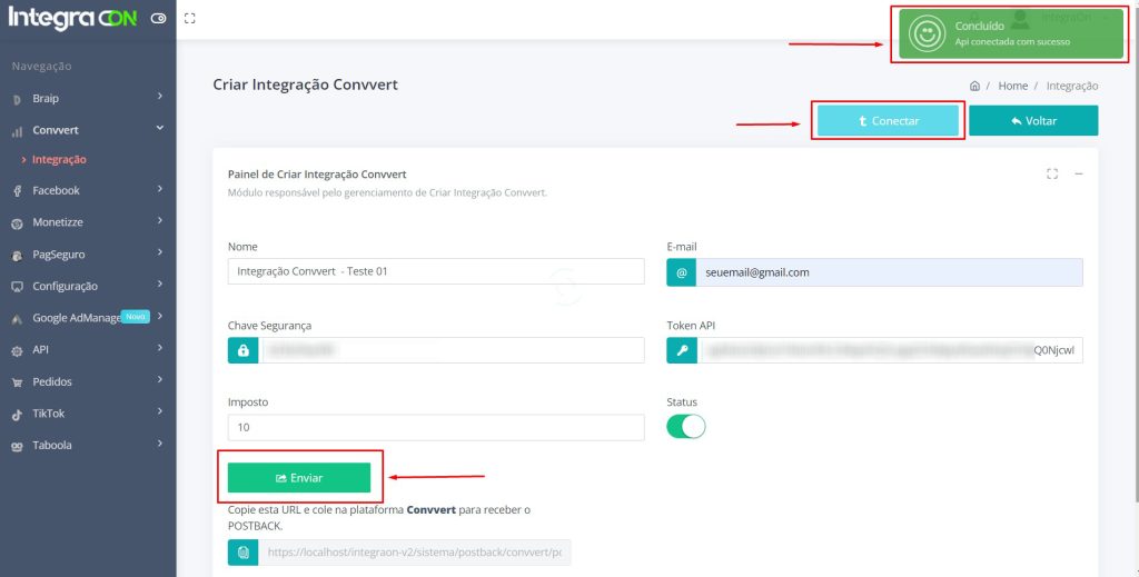 13 – Após realizar os procedimentos descritos acima, volte ao sistema IntegraOn e clique no botão “Conectar” para verificar se foi realizada a conexão com a plataforma Convvert. Caso estejam todos os dados corretos o sistema irá apresentar a mensagem de “API conectada com sucesso”. Depois clique no botão “Enviar” para finalizar o cadastro. Conforme exemplo abaixo: