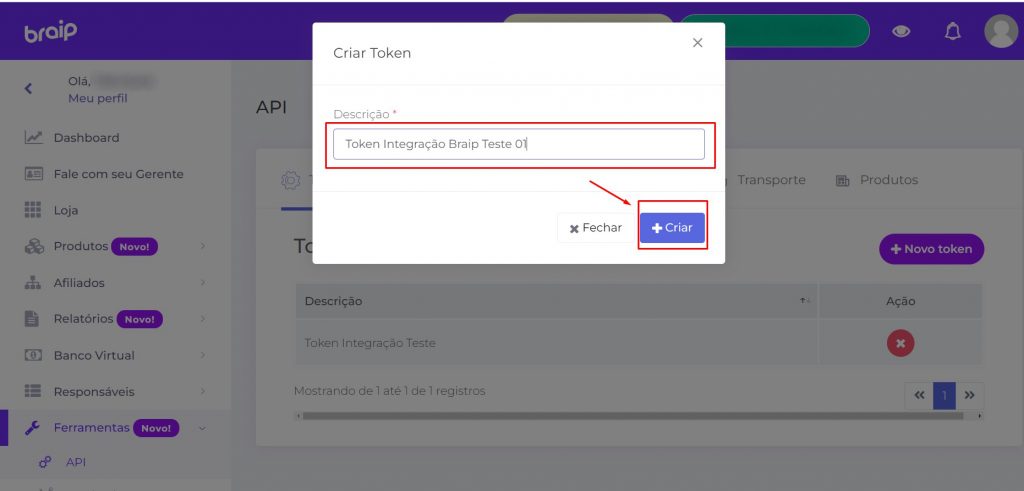5 – Após clicar em “Novo token”, Insira a descrição do Token e clique em “Criar”, conforme exemplo abaixo: