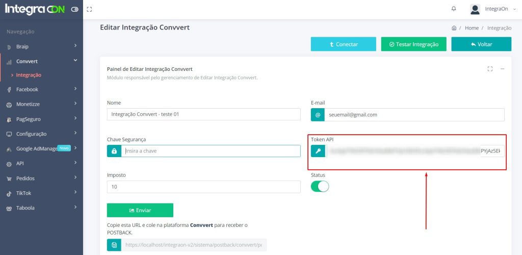 7 – Após copiar o Token, insira-o dentro do sistema IntegraOn(Convvert->integração) no campo “Token API”. Conforme exemplo abaixo: