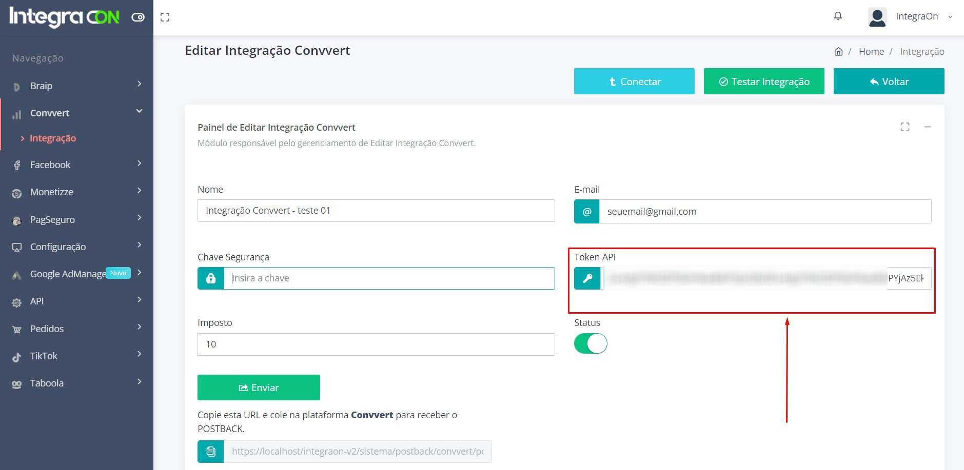 7 – Após copiar o Token, insira-o dentro do sistema IntegraOn(Convvert->integração) no campo “Token API”. Conforme exemplo abaixo: