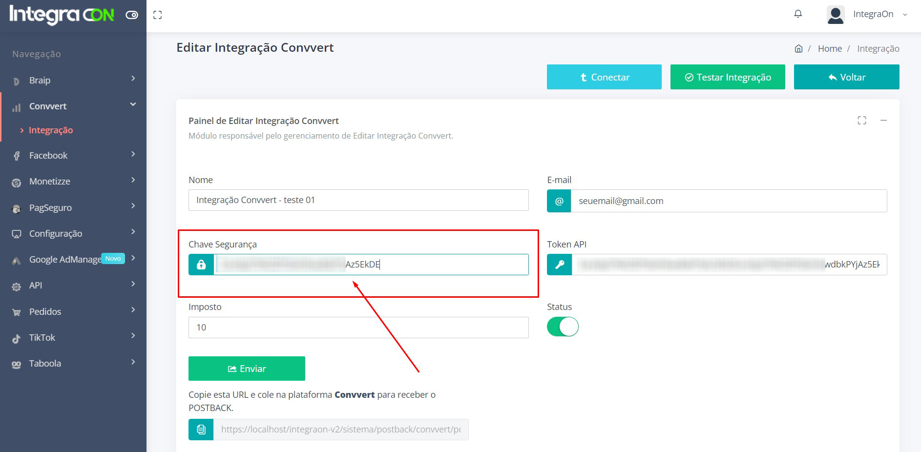 9 – Após copiar a Chave de Segurança, insira-a dentro do sistema IntegraOn(Connvert->integração) no campo “Chave Segurança”. Conforme exemplo abaixo:
