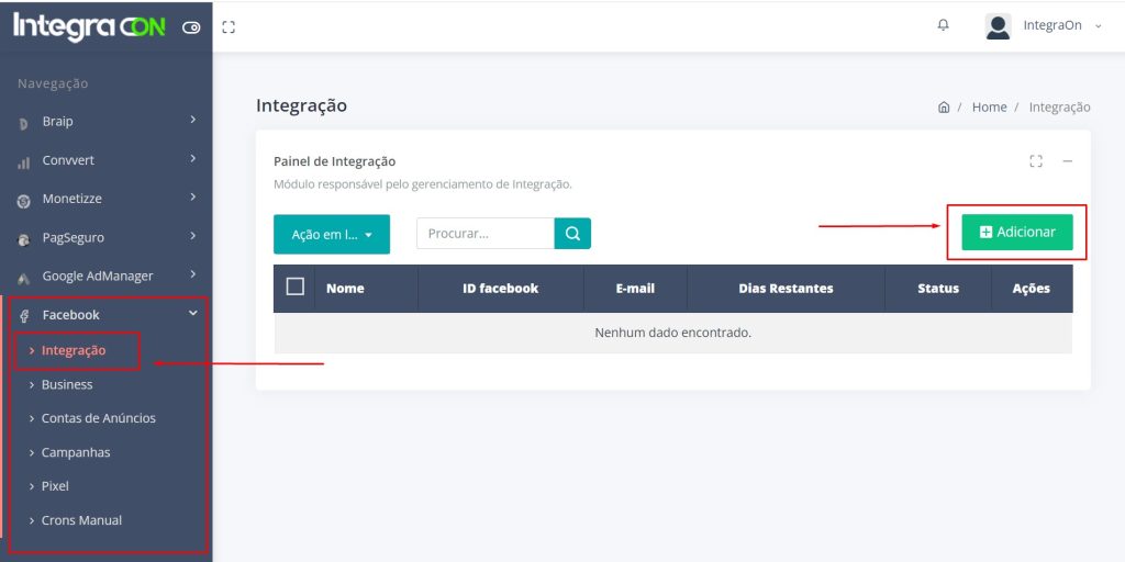 1 – Acesse o sistema IntegraOn, localize o menu “Facebook->Integração” e clique no botão “Adicionar”. Conforme exemplo abaixo: