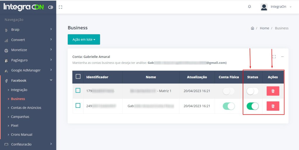 5 – Após selecionar a Conta Business e a data, será listado todas as Contas de Anúncios relacionado a conta, permitindo assim, realizar ativação, desativação e exclusão das contas . Conforme exemplo abaixo: