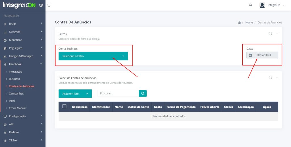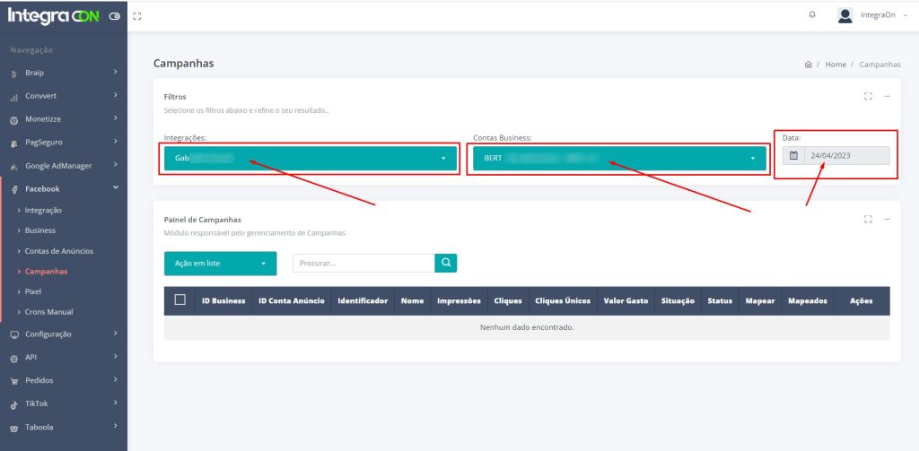 6 – Para visualizar as Campanhas, selecione a Integração, a Conta Business e a data que deseja. conforme exemplo abaixo: