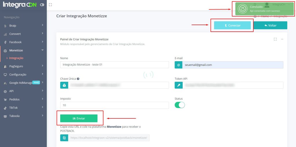 13 – Após realizar os procedimentos descritos acima, volte ao sistema IntegraOn e clique no botão “Conectar” para verificar se foi realizada a conexão com a plataforma Convvert. Caso estejam todos os dados corretos o sistema irá apresentar a mensagem de “API conectada com sucesso”. Depois clique no botão “Enviar” para finalizar o cadastro. Conforme exemplo abaixo: