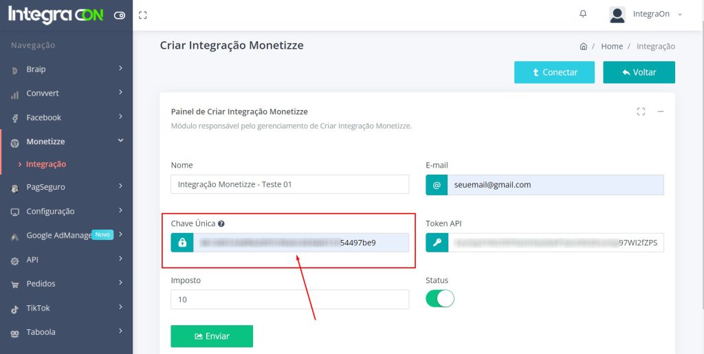 9 – Após copiar a Chave Única, insira-a dentro do sistema IntegraOn(Monetizze->integração) no campo “Chave Única”. Conforme exemplo abaixo: