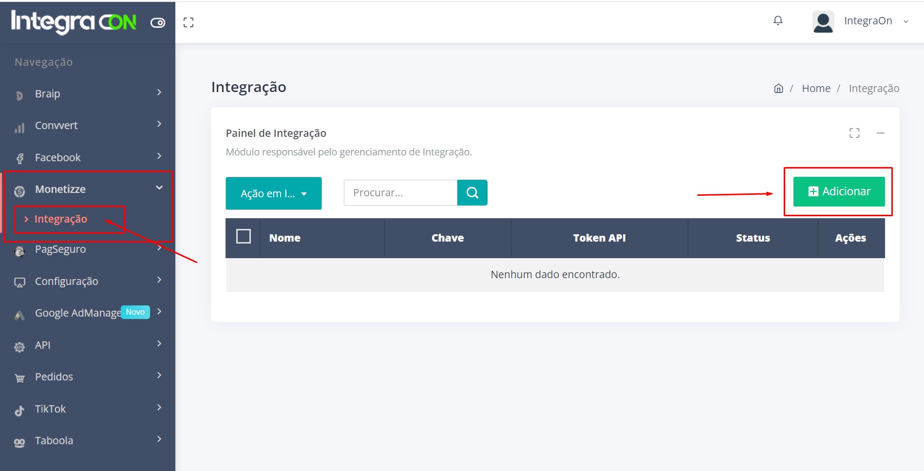 1 – Acesse o sistema IntegraOn, localize o menu “Monetizze->Integração” e clique no botão “Adicionar”. Conforme exemplo abaixo: