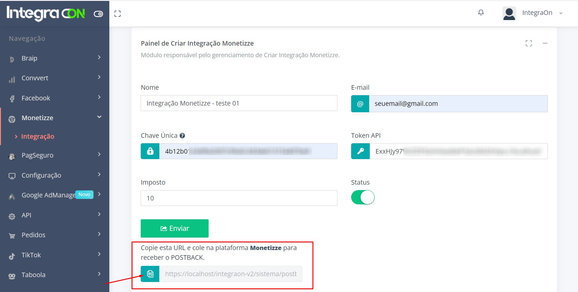 9 – Após copiar a Chave Única, insira-a dentro do sistema IntegraOn(Monetizze->integração) no campo “Chave Única”. Conforme exemplo abaixo: