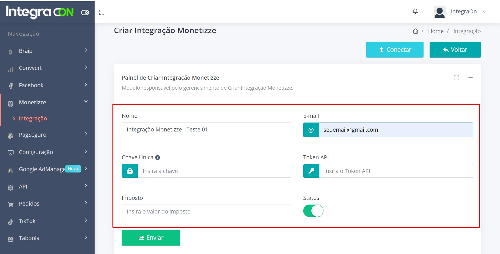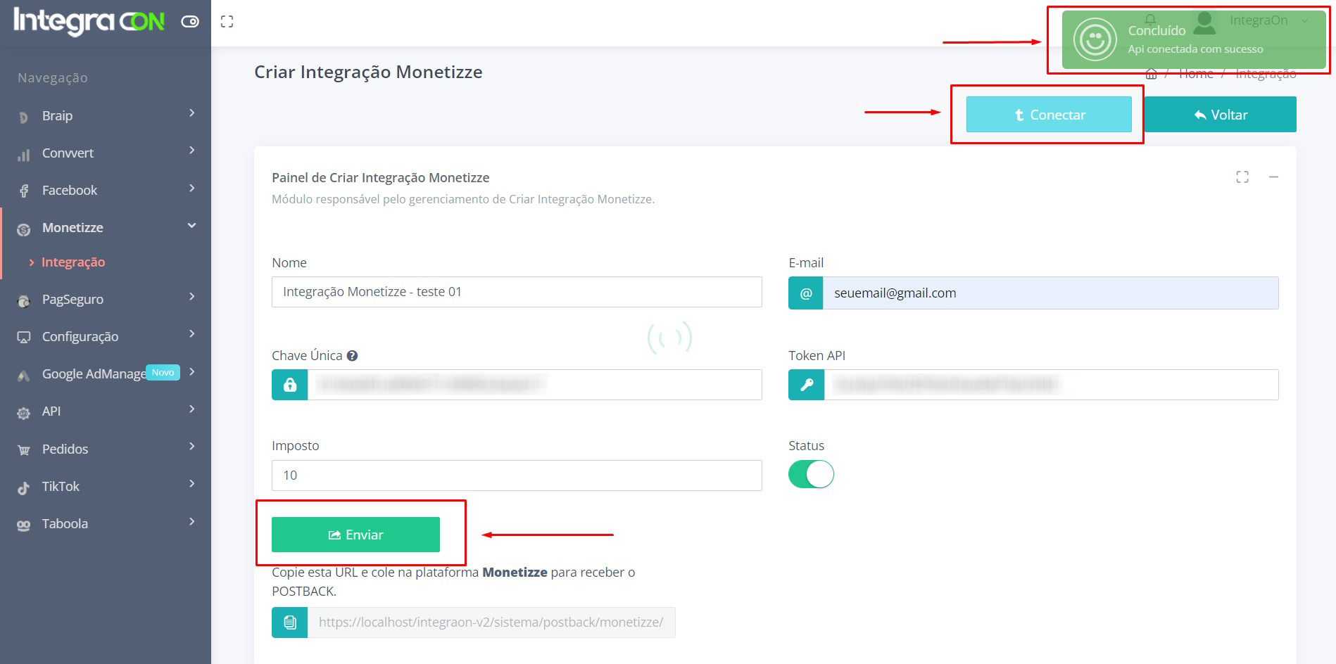 13 – Após realizar os procedimentos descritos acima, volte ao sistema IntegraOn e clique no botão “Conectar” para verificar se foi realizada a conexão com a plataforma Convvert. Caso estejam todos os dados corretos o sistema irá apresentar a mensagem de “API conectada com sucesso”. Depois clique no botão “Enviar” para finalizar o cadastro. Conforme exemplo abaixo: