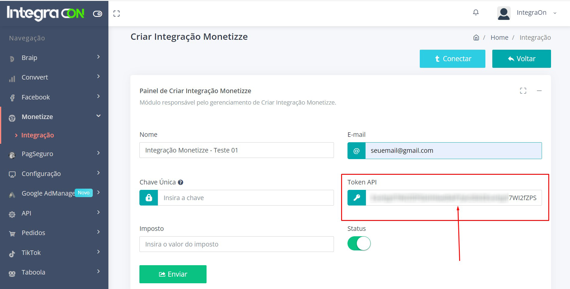 7 – Após copiar o Token, insira-o dentro do sistema IntegraOn(Monetizze->integração) no campo “Token API”. Conforme exemplo abaixo: